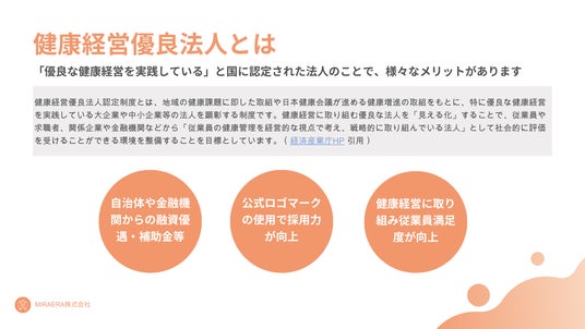 健康経営支援サービス【Health Manager】を運営するMIRAERA株式会社(本社:東京都渋谷区、代表取締役:前田 美里、以下当社)は「2025健康経営優良法人認定支援プラン」を新たにスタートしました。健康経営の更なる高まりを見据え、医師免許を持つ連続起業家のもと企業様を支援いたします。