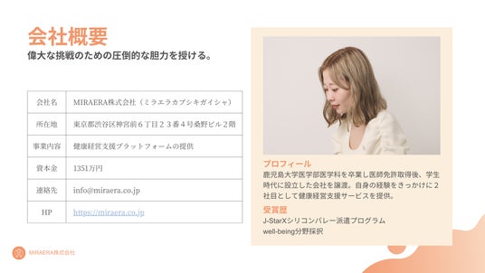 1996年熊本県出身。鹿児島大学医学部医学科卒業、第116回医師国家試験合格。合同会社の人事、キャリア団体代表を経て在学中の2021年に1社目を設立、ブランド開発支援事業を立ち上げから1年半で譲渡。ビジネスドメインからメンタルヘルス業界を革新することをミッションに、2社目となるMIRAERA株式会社を設立。J-StarXシリコンバレー派遣プログラムwell-being分野採択。
