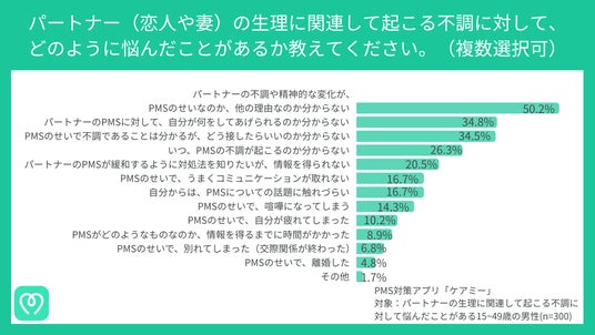 ケアミーの過去の調査では、これまでにパートナーがいたことのある男性のうち、約2人に1人がパートナーのPMSに「悩んだことがある」と回答しました(※3)。では、男性は具体的にどのような悩みを抱えているのか。一番多かった回答は、「パートナーの不調や精神的な変化が、PMSのせいなのか、他の理由なのか分からない」で50.2%、次いで「パートナーのPMSに対して、自分が何をしてあげられるのか分からない」が34.8%、「PMSのせいで不調であることは分かるが、どう接したらいいのか分からない」が34.5%でした。パートナーのPMSに悩む男性の2人に1人が、不調の原因がはっきり分からないことで悩んでおり、さらに、不調の原因がPMSと分かっている場合でも、パートナーにどう接したらよいのか対応に悩む男性が多いことがうかがえます。