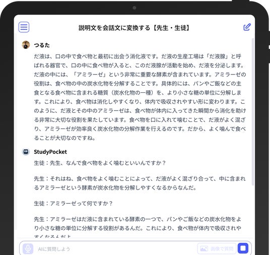 教科書的な説明文章を、会話形式のフォーマットに変更してくれる機能(逆引きモードの例/プロンプト不要)