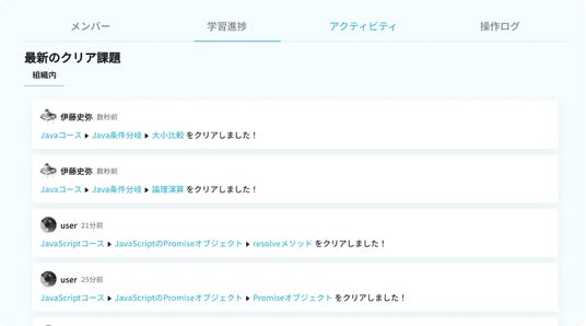 社員一人ひとりの学習進捗や理解度を、管理者が一覧で確認できるLMS(Learning Management System)を搭載。各社員がどんなレッスンに取り組んでおり、どれくらい理解しているかを確認できます。