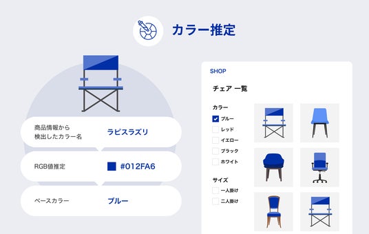 また、「カラー推定」の機能が拡充したことで、カラー情報を有していない商品に対し、商品名、商品説明文、商品スペックから、該当商品のカラーカテゴリを推定することができるようになります。入力値となる自然言語(商品名、商品説明文、商品スペック)をベクトル化し、独自のAIモデルを適用することで実現しております。推定されたカラーは日本語名称とカラーコードで定義されるため、データのフィルタリングやWEB上での表現にも役立ちます。