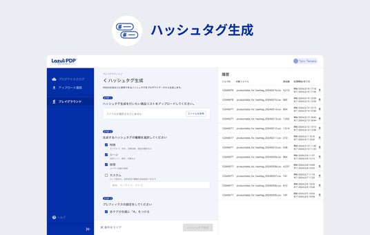 「Lazuli PDP」は、複数のデータベースに点在していた商品情報を統合し、データの連携に必要な商品説明文やメタタグ、ハッシュタグといったプロダクトデータを生成し、各連携ツールに合わせたフォーマット変換を自動で行うSaaSです。メーカーや小売業者、製薬業者などが保有する多様な商品マスタデータを、AIを活用して名寄せし、メタタグの付与やカテゴリ推定などを行い、ユーザに提供しています。今回の機能アップデートにより、新たに生成AIによる「ハッシュタグ生成」と「カラー推定」が可能となりました。
