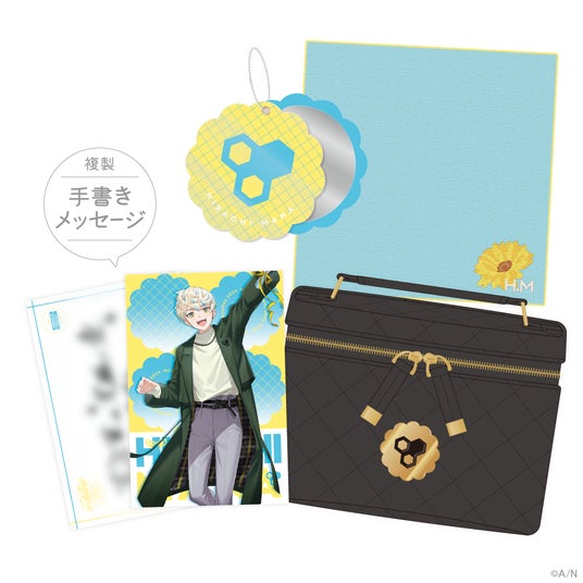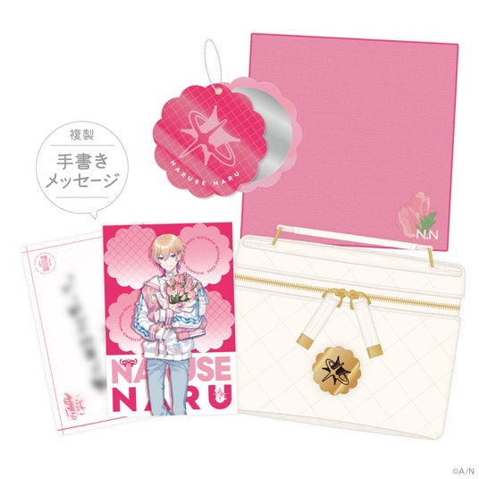 スライドアクリルミラー、ミニハンカチタオル、複製メッセージ入りポストカードとバニティポーチがセットになったギフトセットの計5種類。