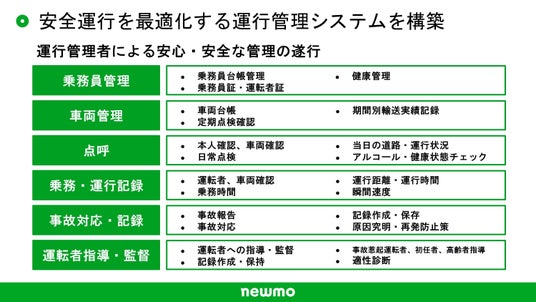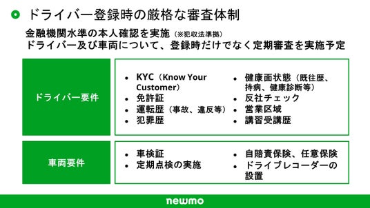newmoではライドシェアにおいても、タクシー同様に利用者が安心・安全に利用いただけるよう、安心・安全対策を最重要と位置づけています。1) ドライバー登録時の金融機関水準の本人確認(犯収法準拠)や、ドライバー・車両に関する厳格な要件の審査(登録時審査・定期審査)に加え、2) 運行時の乗務員管理、車両管理、点呼、乗務・運行記録、事故対応・記録、運転者指導・監督など安全運行を最適化する運行管理システムを構築することにより、安全性を担保します。