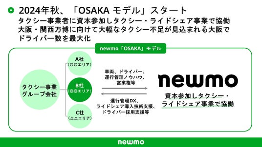 また、今回のパートナーシップについて、近隣エリアに複数のグループ会社を有するタクシー事業者がライドシェアへの参入を検討される際、グループ傘下の1社とnewmoが提携しライドシェア事業を開始する「OSAKAモデル」として、他地域でも同様のパートナーシップを通じたライドシェア事業を展開してまいります。
