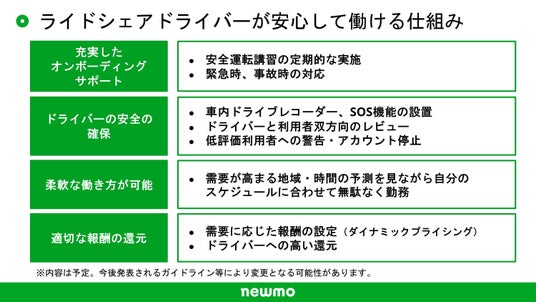 ライドシェアドライバーの拡大においては、安全運転講習の実施や事故対応、SOS機能など安心して働ける仕組みを整備するほか、需要に応じた報酬(ダイナミックプライシング)の設定や高い還元を通じて、女性・若年層を中心に担い手の裾野を広げます。