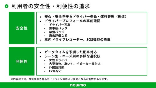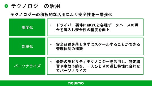 また、ドライバー登録時に最新のeKYC(オンライン本人確認)や、事故歴・違反歴・犯罪歴・反社チェック等に外部データベースを活用する「高度化」、特定講習や事故予防に最新のモビリティテクノロジーを使い一人ひとりの運転特性に合わせる「パーソナライズ」など、安全性の向上に向けたテクノロジーの活用も推進していきます。