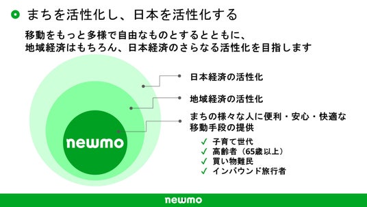 newmoでは、子育て世代や高齢者、買い物難民、インバウンド観光客といった様々なニーズに対し、便利・安心・快適な移動手段を提供することを通じて、”移動の負”の解消に留まらず、地域経済の活性化、さらには日本経済の活性化を目指していきます。