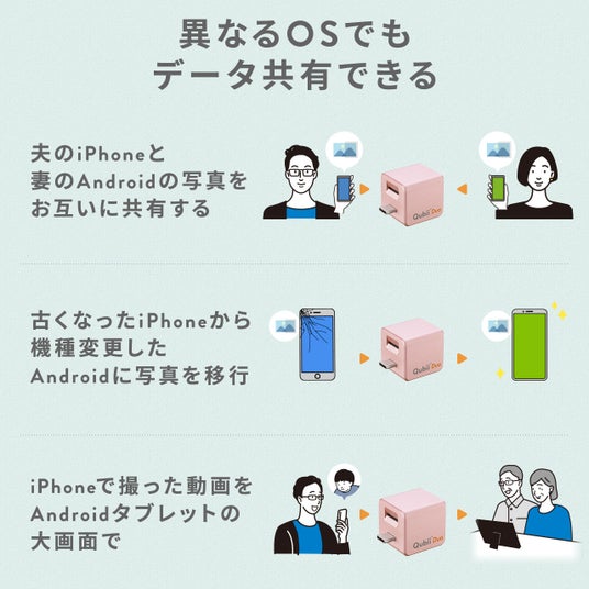 ACアダプタ、本製品、スマートフォンをケーブルで接続し、専用アプリ「Qubii Pro」を使用することで、接続するたびに自動でデータをバックアップできます。