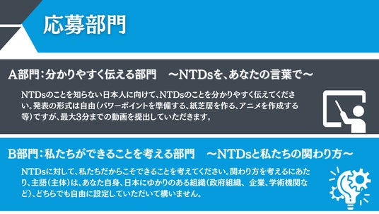 世界NTDの日(1月30日)の連動企画として開催された本コンテストは中学生から大学院生までの生徒・学生を対象とし、個人もしくは4名までのチームで参加を条件としました。応募部門として「A部門:NTDsを分かりやすく伝える ~NTDsを、あなたの言葉で~」と「B部門:私たちができることを考える部門 ~NTDsと私たちの関わり方~」の二つの部門を設け、作品を広く募集しました。