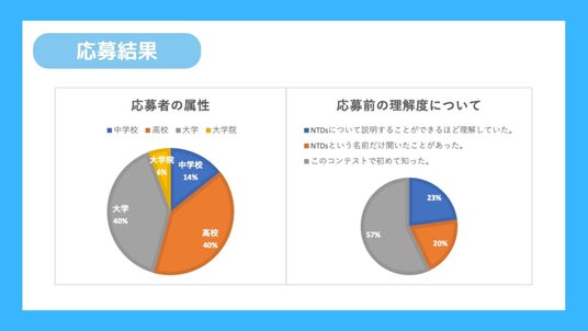 NTDsをはじめとする国際保健分野では、"自分ごと"として考える機会の少なさが課題の一つです。しかし、本コンテストを通して、この顧みられていない課題について応募者が悩み、考え、発表することを通して、"自分ごと"として行動できたとの声が多くありました。また、応募者が自主的に調べ、分かりやすく伝える機会を通して学びを深められたようです。