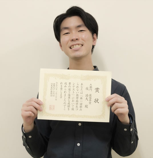 A部門最優秀賞の賞状を手にする牧 功大氏=2024年2月29日、受賞者提供A部門 最優秀賞受賞したのは大分大学医学部医学科5年の牧 功大氏。西郷隆盛が感染したとされるリンパ系フィラリア症を切り口としてNTDsに対して分かりやすい動画を発表しました。テンポの良い動画で、視聴者を飽きさせない構成が評価されました。