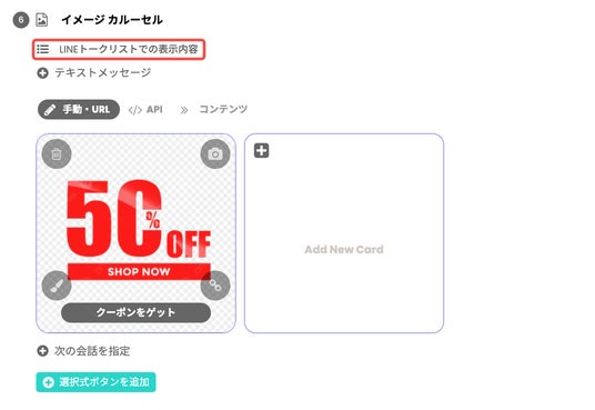 例えば、50%割引クーポンを期間限定で配布する際、トークリストにも「期間限定でクーポンゲット!」などと訴求文言を設定しておきます。