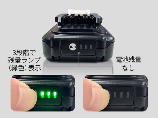 【電池残量ランプ付き】バッテリーの「電池マークボタン」を押すと、電池残量が一目で確認できます。