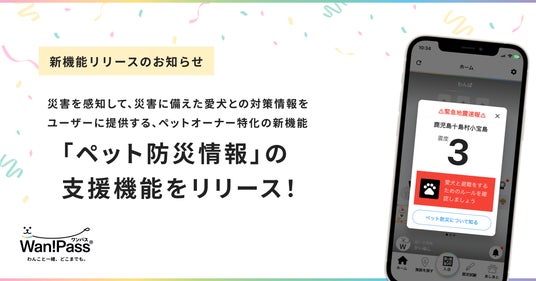 ペッツオーライ株式会社(本社:東京都中央区、代表取締役CEO:小早川斉、以下ペッツオーライ、https://petsallright.net/ )は、運営するペットとのお出かけ支援アプリ「Wan!Pass(ワンパス)」にて、新たに震災発生時のペット防災を支援する機能を追加し提供を開始しました。知っておくべきペット防災に関する知識をいつでも学べる認定クイズが追加され、さらに震度3以上の地震発生時アラートと共にペット防災に必要な情報をリアルタイムで受信できるようになりました。