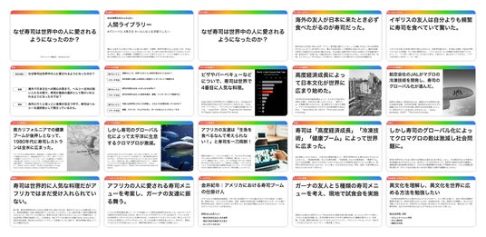 ステップに沿って学習を進め、テキスト等を入力すると、入力内容がそのままスライドに反映され、探究の成果資料がアウトプットされます。出来上がったスライド資料は、校内の発表会などに利用することも可能なので、資料の体裁やデザインに時間をかけすぎず、より中身に時間を割きたいという際にもぴったりです。