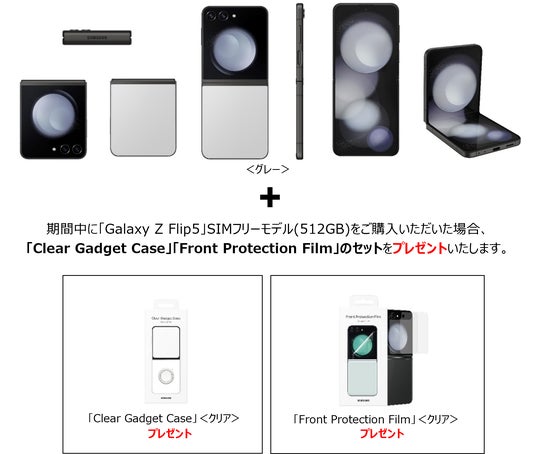 https://www.samsung.com/jp/smartphones/galaxy-z-flip5/「Galaxy Z Flip5」専用「Clear Gadget Case」、「Front Protection Film」詳細