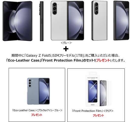 ※「Galaxy Z Fold5」SIMフリーモデル(1TB)をカートに追加いただくと、自動で10%割引価格が表示され「Eco-Leather Case」のカラーをお選びください。「Front Protection Film」<クリア>は自動で追加されます。
