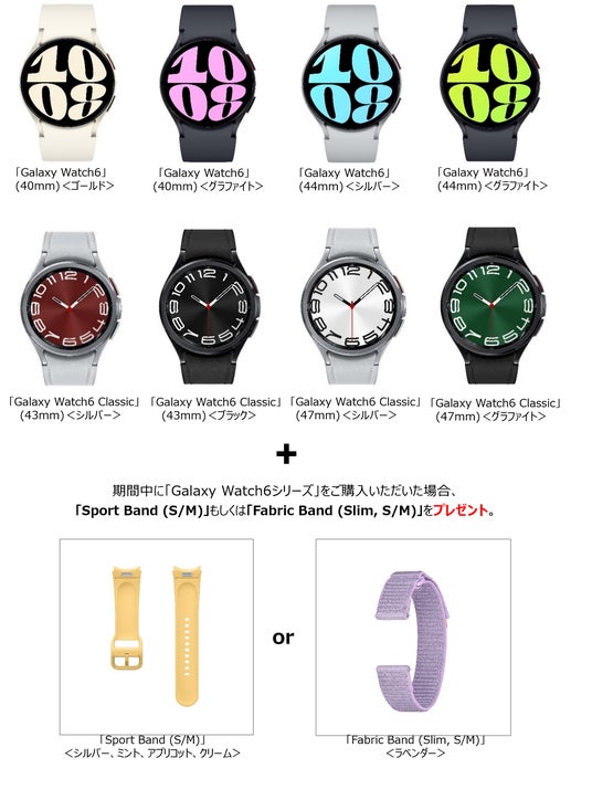 ※「Galaxy Watch6シリーズ」1点をカートに追加いただくと、自動で10%割引価格が表示されます。その後、「Sport Band (S/M)」もしくは「Fabric Band (Slim, S/M)」をお選びください。