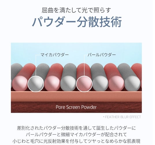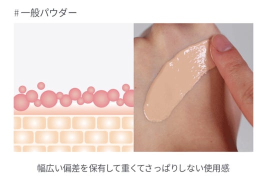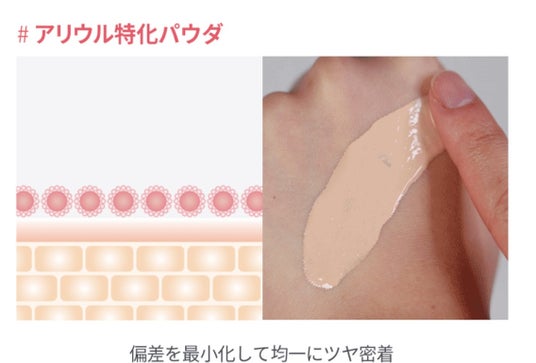 一般的なパウダーは、粒子が均一ではない為、重く伸びやなじみが悪い印象。アリウルのパウダーは、粒子が均一の為、伸びが良く肌に馴染み、光の反射効果で、つや肌に!!