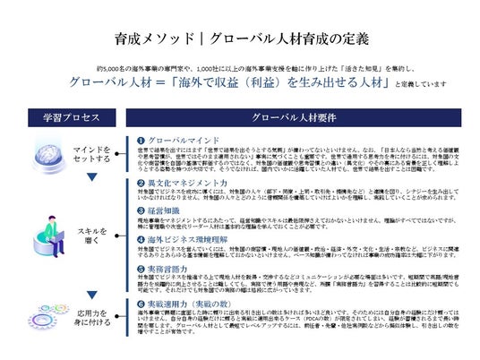 「海外で収益を生み出す人材」を育てるべく、体系的に設計された日本初*のグローバル人材育成特化型eラーニングサービスです。