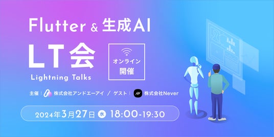 モバイルアプリ開発及びAIサービスの開発を行う株式会社アンドエーアイ(旧社名:ドリグロ、本社:東京都渋谷区、代表取締役社長:西 真央、以下:当社)は、2024年3月27日(水)18:00~19:30に、Flutterでのアプリ開発や生成AIに関するLT会をオンラインで開催いたします。当社としては初の試みとなるこのLT会では、特別ゲストとして株式会社Neverの方々をお招きし、最前線で活躍する7名のエンジニアが知見を共有します。