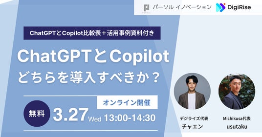 本セミナーでは、AI専門家である株式会社デジライズの茶圓 将裕氏と、Michikusa株式会社の臼井 拓水氏が、ChatGPTとCopilotを徹底比較し、機能や料金、活用方法などを解説します。