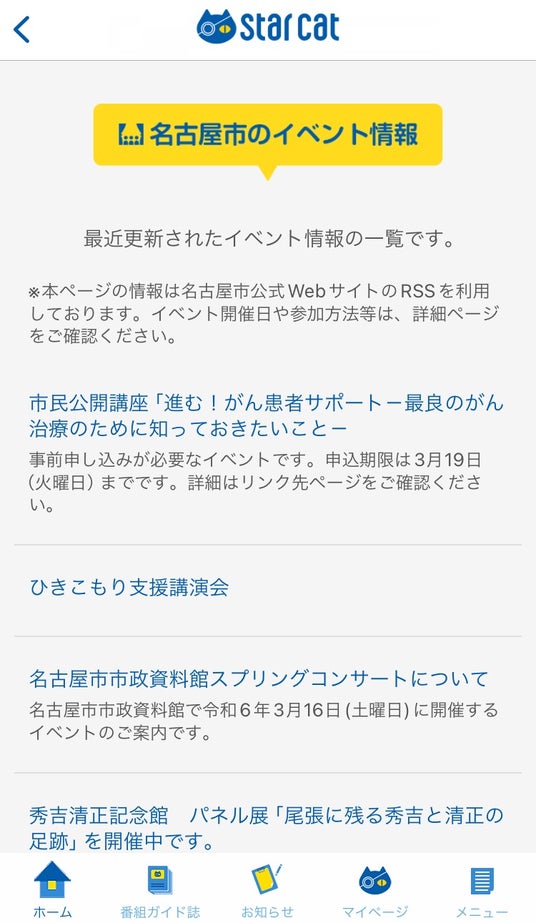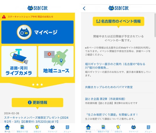 スターキャット・ケーブルネットワーク株式会社(本社:愛知県名古屋市、代表取締役社長:松下寿昭、以下「スターキャット」)は、公式アプリにおいて、名古屋市内で開催されるイベント情報の確認およびスターキャットが取材した地域のニュース番組を視聴できる機能を新たに追加いたします。