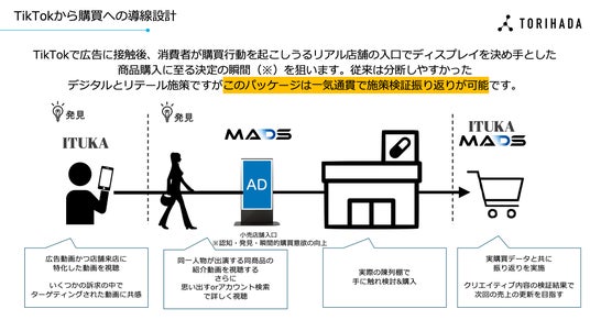 本パッケージはTikTokのクリエイティブ検証付き縦型広告配信プランを展開するITUKA(TORIHADA運営)とドラックストアを中心としたデジタルOOH アドネットワーク事業を行う株式会社MADSとの協業パッケージです。