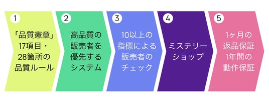 そこで、Back Marketでは以下の5つのステップで、リファービッシュ製品の高い品質を提供しています。当社で販売するデバイスを扱う販売業者の皆様には当社独自の品質ガイドラインを設け高い品質の商品を出品いただいたり、またミステリーショップなども実施し、販売前、販売後の全てのプロセスにおいてお客様にご満足をいただけるサービスを提供しているかなども確認をしています。今回「Back Up」を提供することにより、さらにお客様に長期間、安心・安全にリファービッシュデバイスをお使いいただける環境を提供いたします。
