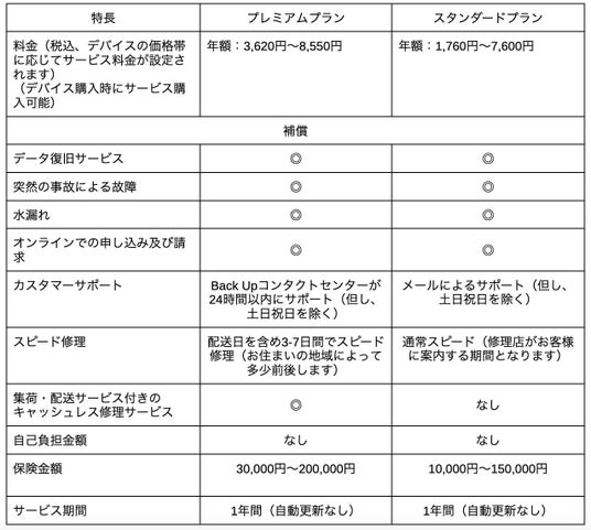 今回ご提供するBack Upサービスは、迅速なカスタマーサポートや修理、集荷・配送サービスが付いた「プレミアムプラン」と、よりリーズナブルな金額でサポートが受けられる「スタンダートプラン」の2種類をご用意しています。