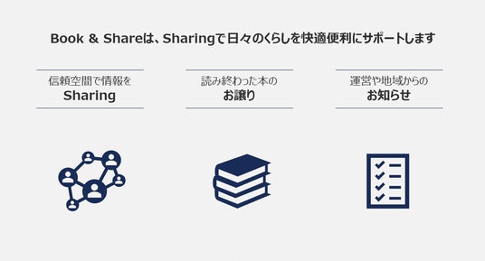 Book & Shareは、シェアリングを通じて日々のくらしを快適便利にサポートするサービスで、主にタワーマンションや中小規模マンションにお住いの方を対象として開発しました。当社は2022年よりマンション住民限定のコミュニティ醸成サービス「GOKINJO」を展開しておりますが、比較的大規模なファミリータイプのマンションを想定して開発した「GOKINJO」と比べ、今回はタワーマンションや、中小規模のマンション住民を対象に、そのコンセプトに合わせた新たなサービスとして展開することとしました。Book & Shareは、住民限定のクローズドな空間で情報を交換できる機能や、不用品や読み終わった本をお譲りできる機能を備えています。また、管理会社や理事会・自治会、周辺地域の店舗等からの情報を、アプリからタイムリーに配信・閲覧することが可能です。