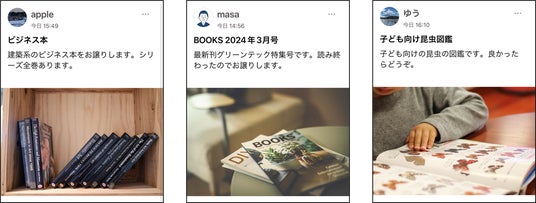 不要になった物品や、読み終わった本を同じマンションの住民にお譲りすることができます。「捨てるにはもったいない」「誰か使ってくれたら」「面白いから読んで欲しい」という、モノや本に関するニーズを捉え、また、廃棄物や配送負荷の削減を通じて循環型社会の実現に貢献します。
