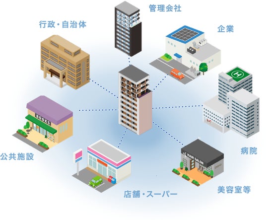 「パートナー連携機能※」により、パートナー専用アカウント(住民向け画面の閲覧制限付)を、管理会社、周辺の自治会・商店等に付与することができます。パートナー専用アカウントからの投稿により、マンション掲示板情報、自治会の回覧板情報、お店からのお得なクーポン等を、住民がアプリからタイムリーに確認できます。この機能により、マンション住民だけの信頼空間を確保しつつ、周辺地域・商店等の活性と、住民の生活利便性向上の両輪の達成を実現します。