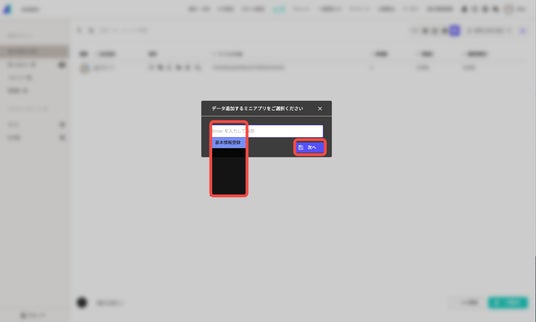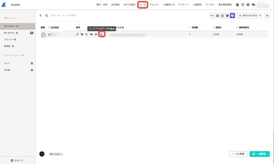 【エボラニ株式会社】「ユーザ」一覧画面で[ミニアプリのデータを編集]をクリック「ユーザ」一覧画面で[ミニアプリのデータを編集]をクリックします。