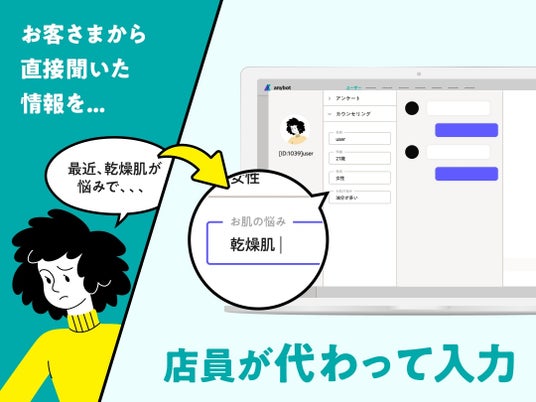 - 化粧品の販売カウンターで接客した際にお客さまから聴き取ったお肌の悩みを、カルテとしてanybotのミニアプリに記入します。