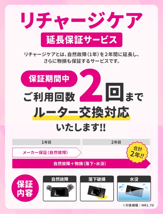 ルーター本体の物損、水没にも対応した2年保証「リチャージケア」をセット