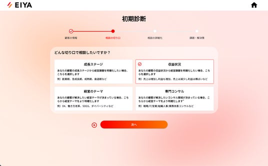 初期診断では、簡単な選択肢を選ぶだけで、それらに該当する経営課題と解決策が提示されます。