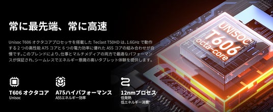 Unisoc T606オクタコアプロセッサを搭載したTeclast T50HDは、1.8GHzで動作する2つの高性能A75コアと6つの電力効率に優れたA55コアの組み合わせが自慢です。このブレンドにより、仕事とマルチメディアの両方で最適なパフォーマンスが保証され、シームレスでエネルギー意識の高いタブレット体験を提供します。Valhallアーキテクチャに基づく高性能Mali-G57グラフィックプロセッサを搭載し、650MHzの周波数で動作するTeclast T50HDは、よりクールな特殊効果とよりスムーズなゲーム体験を提供します。また、AR(拡張現実)やVR(仮想現実)のような最先端のアプリケーションをサポートすることができます。