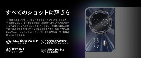 ファッショナブルで美しいユニボディデザインと洗練されたストレートエッジの外観が自慢されるタブレット、即ちこのTeclast T50HDのスタイリッシュなエレガンスを体験してください。革新的なラミネート加工により、タブレットの薄さはわずか7.8mm、重さは530gと軽量に仕上がっているものです。テクノロジー、デザイン、利便性の見事な融合。バックアッセンブリープロセスを採用したTeclast T50HDは、洗練されたユニボディデザインが特徴です。宇宙のエレメントからインスピレーションを得たオーラ・リングのデザインは、革新と美学の融合を象徴しています。鮮やかなテクスチャーで飾られたタブレットのカメラモジュールのデザインは、装飾的でダイナミックな表面を作り出し、その洗練された外観をさらに引き立てています。