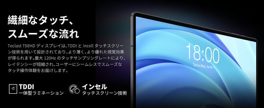 TUV SUDブルーライト認証により、完全な目の保護を提供します。明るいオフィスにいても、自宅でくつろいでいても、有害なブルーライトから目を保護し、常に快適な視聴体験を提供します。Teclast T50HDディスプレイは、TDDIとIncellタッチスクリーン技術を用いて設計されており、より薄く、より優れた視覚効果が得られます。最大120Hzのタッチサンプリングレートにより、レイテンシーが短縮され、ユーザーにシームレスでスムーズなタッチ操作体験をお届けします。