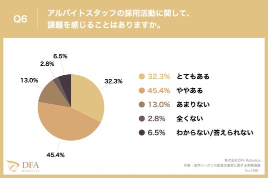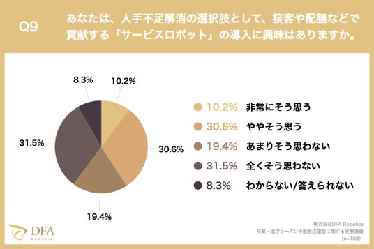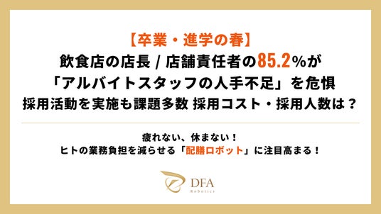 飲食店DXを推進するロボティクスソリューションカンパニーである株式会社DFA Robotics(本社:東京都渋谷区恵比寿、代表取締役:波多野昌昭)は、10名以上のアルバイトスタッフを雇っている、飲食店の店長・店舗責任者108名を対象にアンケート調査を実施しました。
