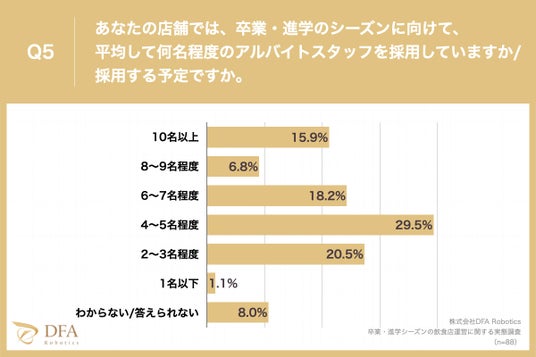 続いて、同じくQ3で「採用費はかけていない」以外を回答した方に「卒業・進学のシーズンに向けて、平均して何名程度のアルバイトスタッフを採用しているか/採用する予定か?」と質問したところ「4~5名程度」が29.5%、「2~3名程度」が20.5%、「6~7名程度」が18.2%という回答となりました。