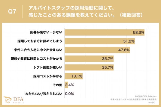 一方で、約8割にあたる77.7%が、アルバイトスタッフの採用活動に課題を感じており、具体的な課題としては、「応募が来ない・少ない」(58.3%)、「採用してもすぐに辞めてしまう」(51.2%)などが挙げられています。