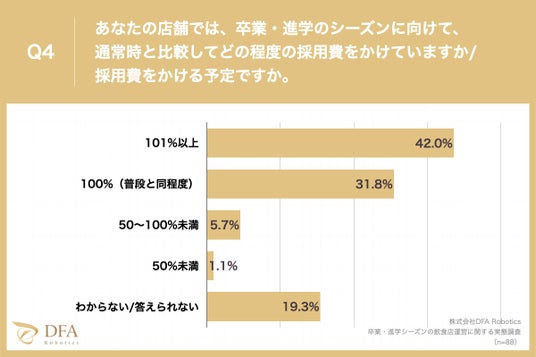 さらに、Q3で「採用費はかけていない」以外を回答した方に「卒業・進学のシーズンに向けて、通常時と比較してどの程度の採用費をかけているか/採用費をかける予定か?」と質問したところ、普段よりも採用費をかける(101%以上)と回答した割合が42.0%という結果になりました。