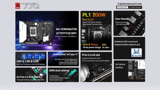 Terminator H770 YTX D5 WIFIの核心は、その革新的なYTXフォームファクタにあります。コンパクトでありながら強力な設計理念は、重要なコンポーネントのスペースを最大限に活用しながら、幅広いケースとの互換性を確保します。このデザインは、200Wの電力制限1 (PL1) と253Wの電力制限2 (PL2) を持つ最新の高性能CPUに対応できる堅牢な8+1+1相電力供給システムによって補完され、負荷下で安定した効率的な電力分配を保証します。