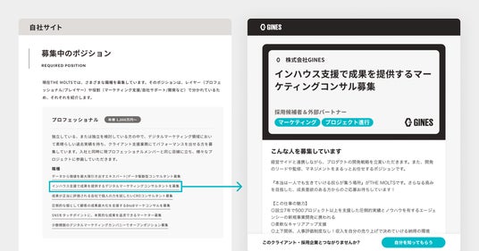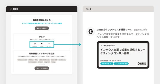 例えば自社サイト・SNSに求人募集を掲載したい時、またはすでにGINESのタレントリストにいる候補者に募集を呼びかけたい時などにご活用いただけます。