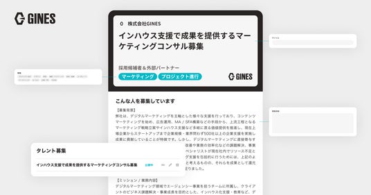 「GINES(ギネス)」は、業務委託や副業人材など社内で抱えている外部パートナーを一元管理・チームで共有が簡単に出来るパートナーリスト構築ツールです。2024年3月19日より、新機能「タレント求人募集機能」をリリース致しました。