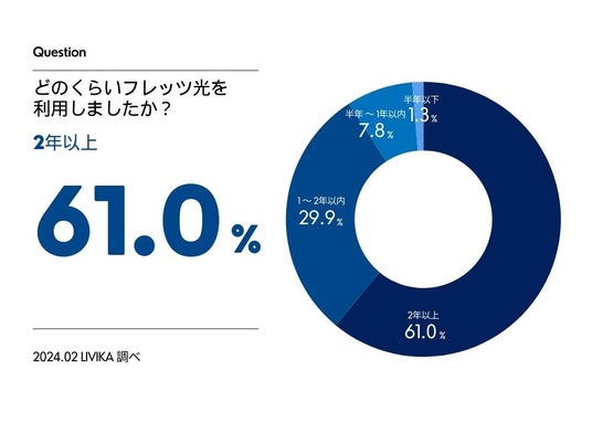 フレッツ光に関する利用期間について、最も多くの方が挙げたのは「2年以上」(61.0%)でした。次いで、「1~2年以内」(29.9%)という結果になりました。